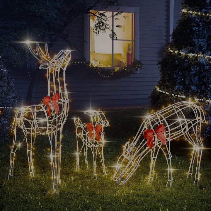 [Set of 3 Christmas Decorations Outdoor] - This set of reindeer Outdoor decorations come with 3 lighted lovely deer with 3 different sizes: 29in x20in x7in/16in x11in x6in/16in x 25in x7in. Also comes with 3pcs * 15m LED light.
